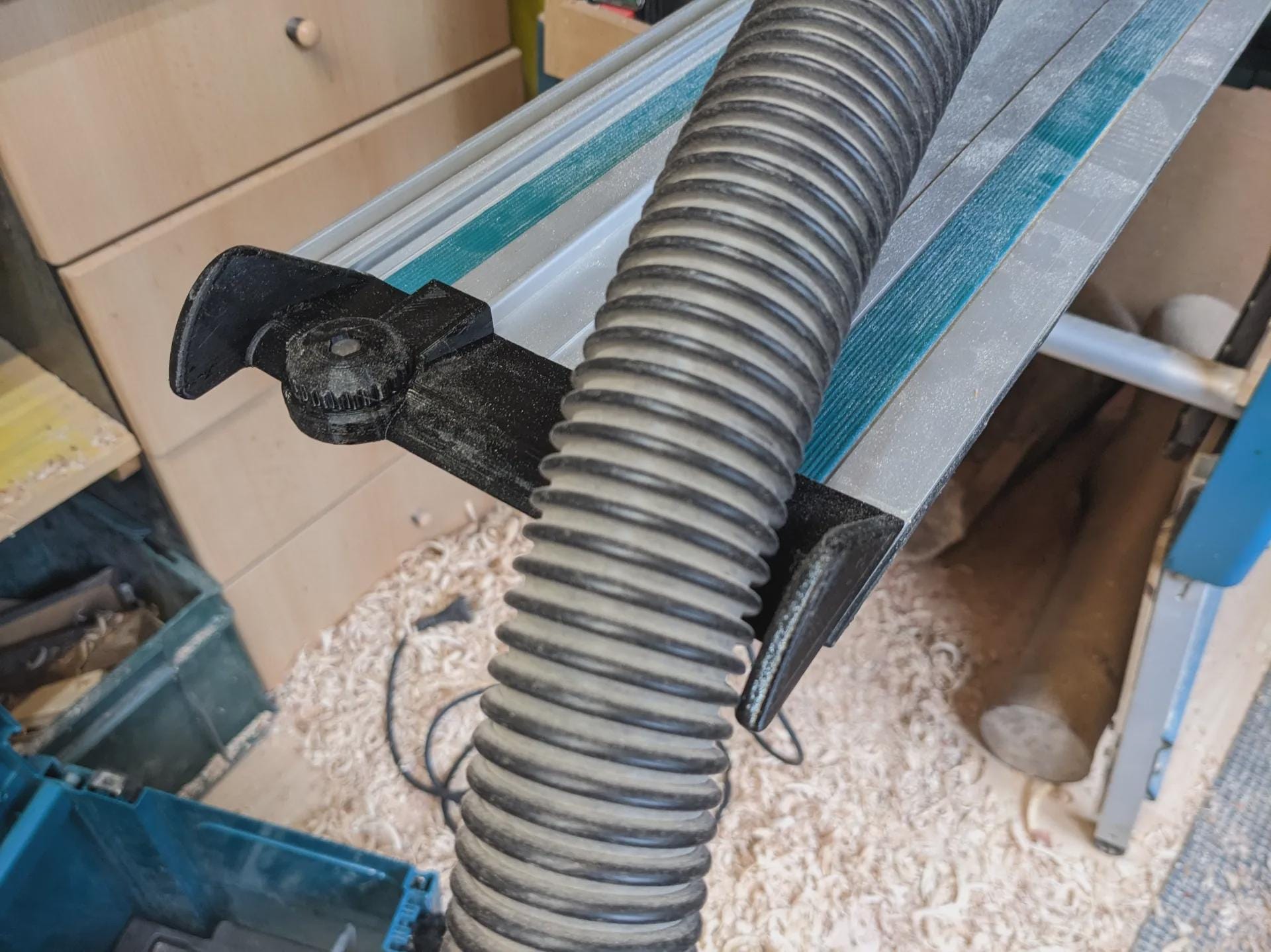 This item is a 3D-printed accessory designed to manage the flexible dust collection hose connected to a track saw. It attaches to the edge of the guide rail and directs the hose connector away from the cutting path and off the end of the track.